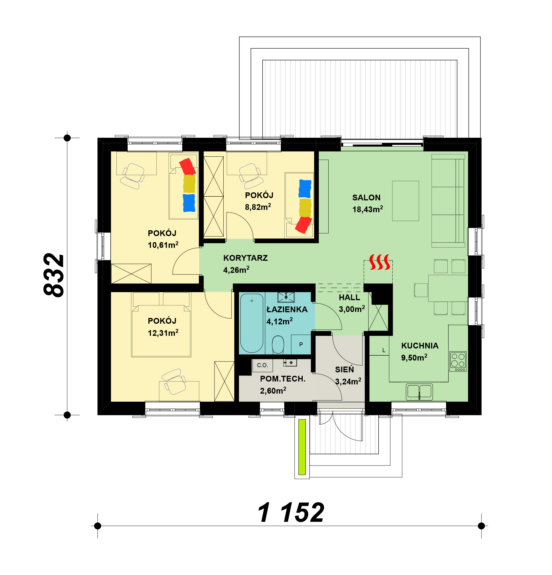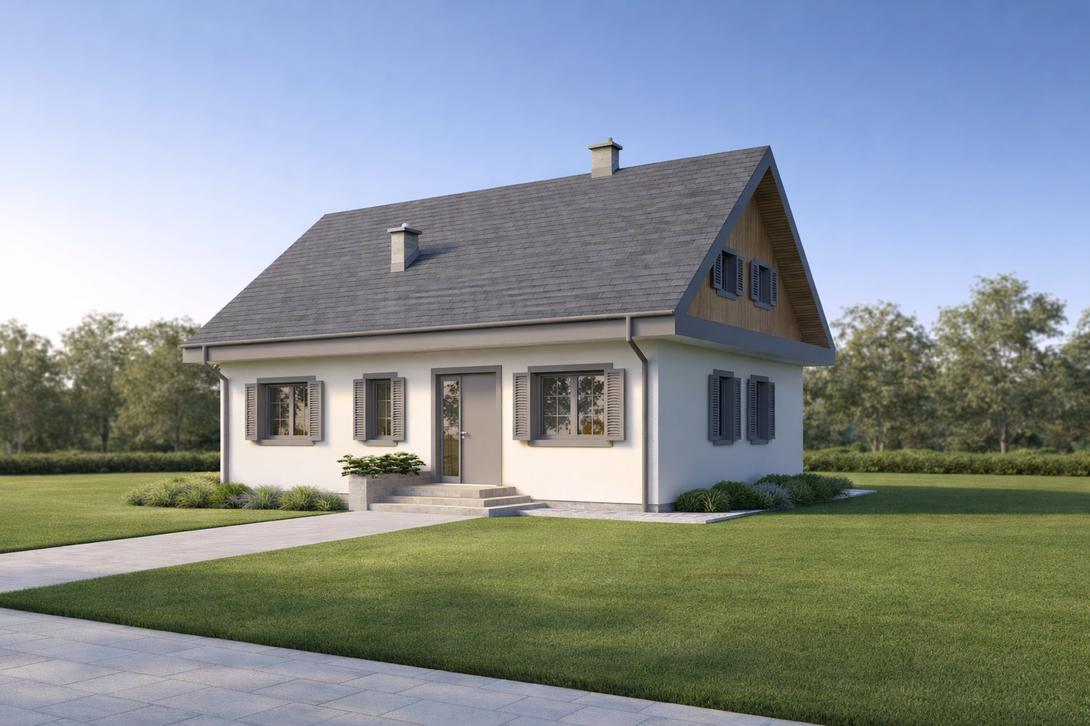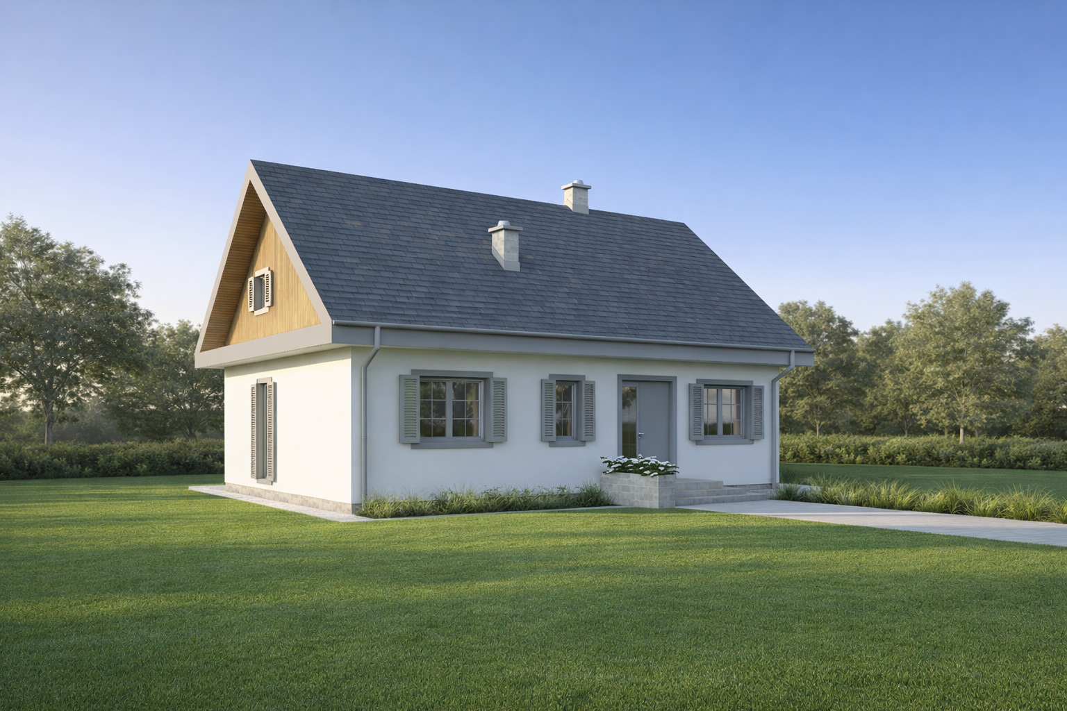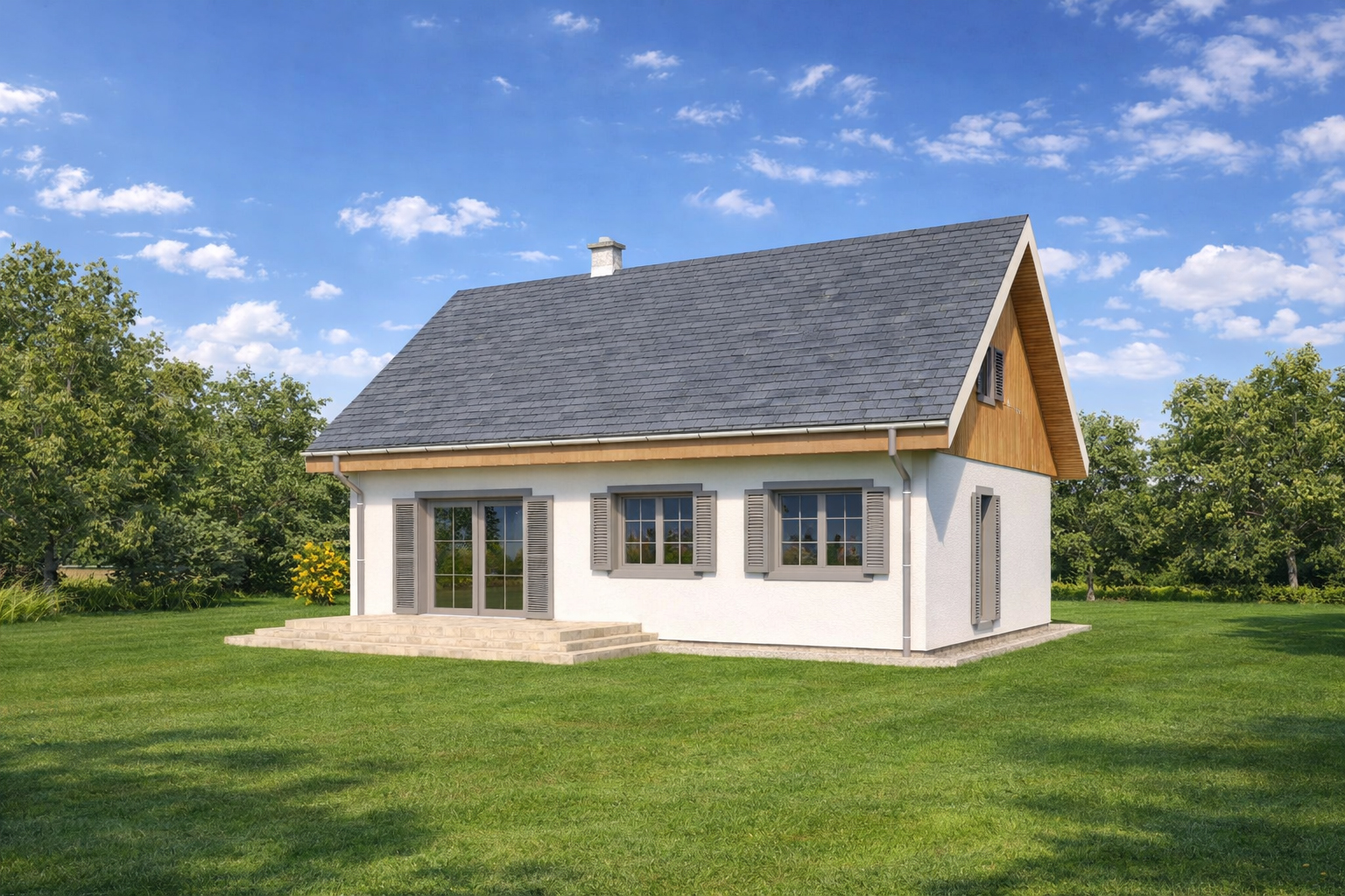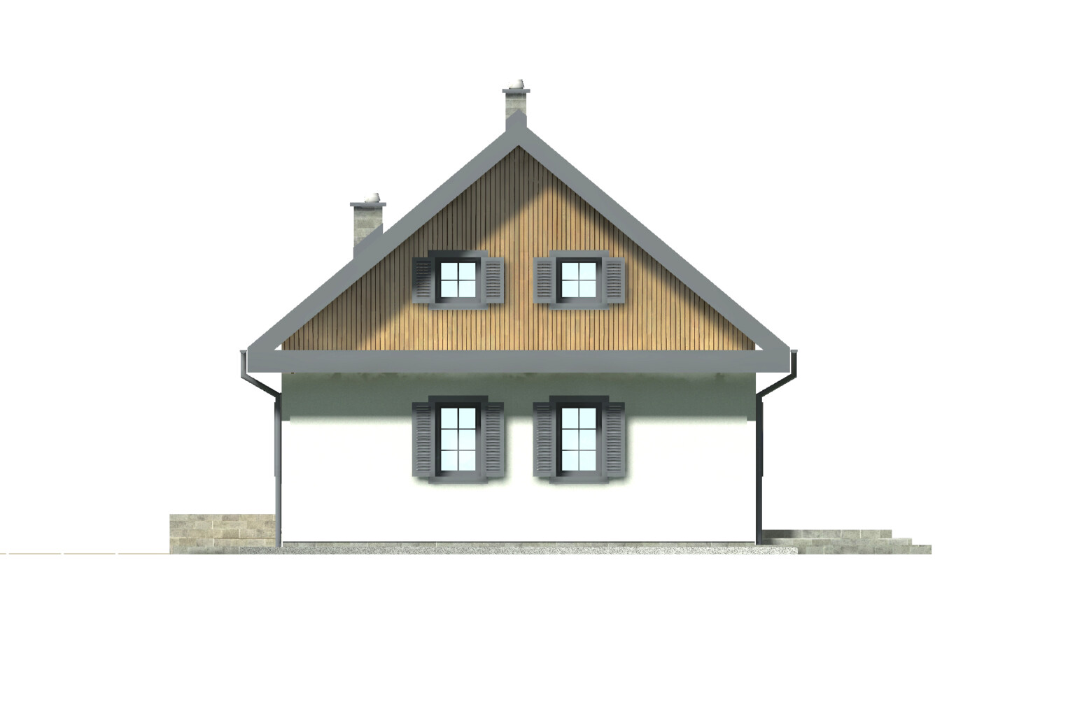 TK9c wyróżnia się klasyczną formą architektoniczną – dwuspadowy dach, symetryczne okna z okiennicami oraz jasna elewacja nadają mu elegancki i przytulny charakter. Naturalne wykończenie podkreśla ponadczasowy styl, który nigdy nie wychodzi z mody. Projekt został stworzony z myślą o komforcie czteroosobowej rodziny. Zwarta bryła, prosty dwuspadowy dach oraz przemyślany układ pomieszczeń sprawiają, że jest to tani w budowie i eksploatacji dom całoroczny, który doskonale sprawdzi się zarówno w mieście, jak i na działce podmiejskiej.